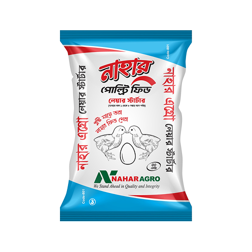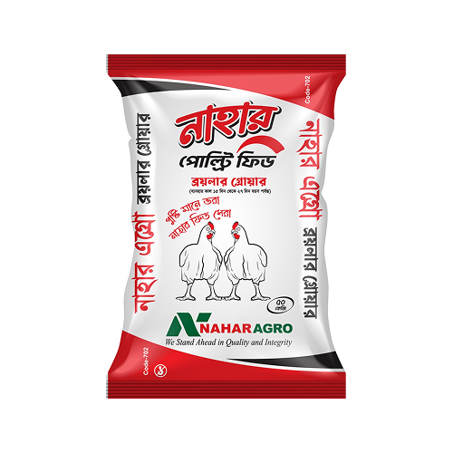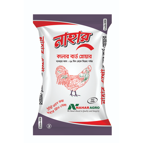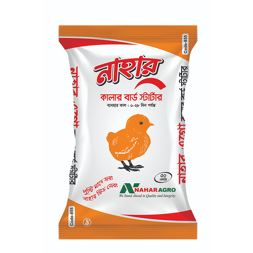 This product is a bag of Nahar Agro's Color Bird Starter Feed, formulated specifically for poultry or bird species in their critical initial growth period, spanning from 0 to 28 days (four weeks). The "Starter" classification indicates it is designed to be highly concentrated and easily digestible, ensuring rapid, healthy growth and robust development of the immune system in chicks. The feed is likely in a fine crumble or mash format. The packaging would feature a professional design, potentially using bright, attractive colors and displaying an illustration of healthy young poultry or chicks. The product name "Color Bird" suggests a formulation that may enhance feather pigmentation or is designed for ornamental birds. The Nahar Agro brand is prominently displayed with the company slogan, "We Stand Ahead in Quality and Integrity," visible beneath it, assuring quality for the poultry sector.