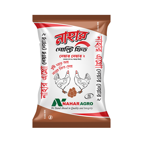 This image displays a 25 KG bag of Nahar Agro's Poultry Feed Layer 2. The packaging is a vertical pouch featuring a professional brown and white color scheme, separated by a distinct red curved line. The product is clearly marked as a Layer Feed 2, which indicates it is specifically formulated for birds during their peak egg-laying phase (post-20 weeks). A prominent illustration of two healthy laying hens beside a clutch of eggs visually confirms the product's purpose. The "Layer 2" designation signifies a feed with a specific protein and calcium content optimized for sustained, high egg production and shell quality. The Nahar Agro brand is centered at the top, and the company slogan, "We Stand Ahead in Quality and Integrity," is displayed below the illustration. The product is clearly identified by the code Code-806.